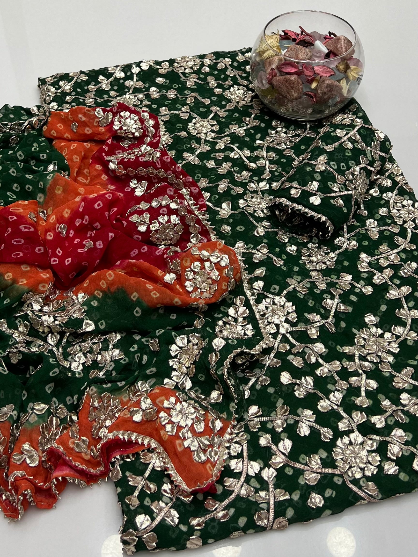 Handmade Chunri Lcd Gotta Work On Bamber Shifoon Full Shirt Jall With 4 Sided Border Multi Dupatta Along Embroidered Sleeves 2pc Suit…