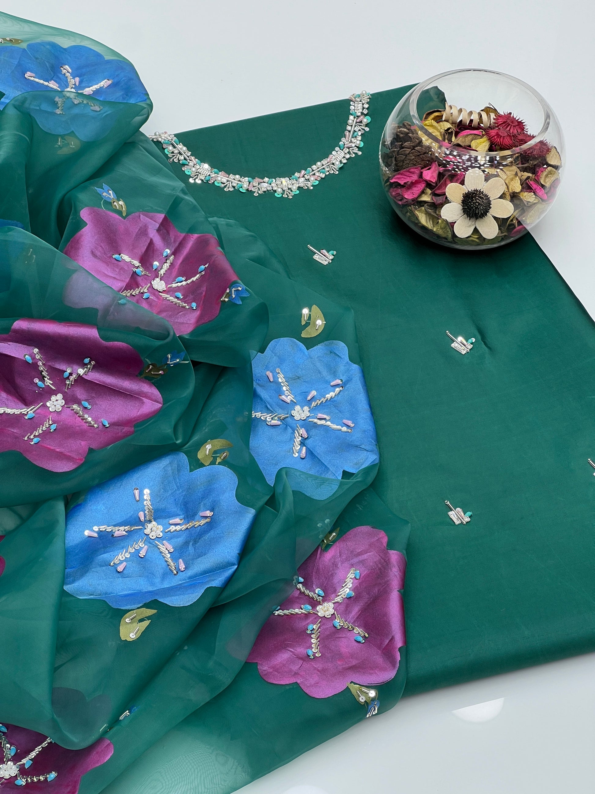 Handmade brush paint with adda work on kathan silk shirt nd trouser with organza dupatta 3pc suit…