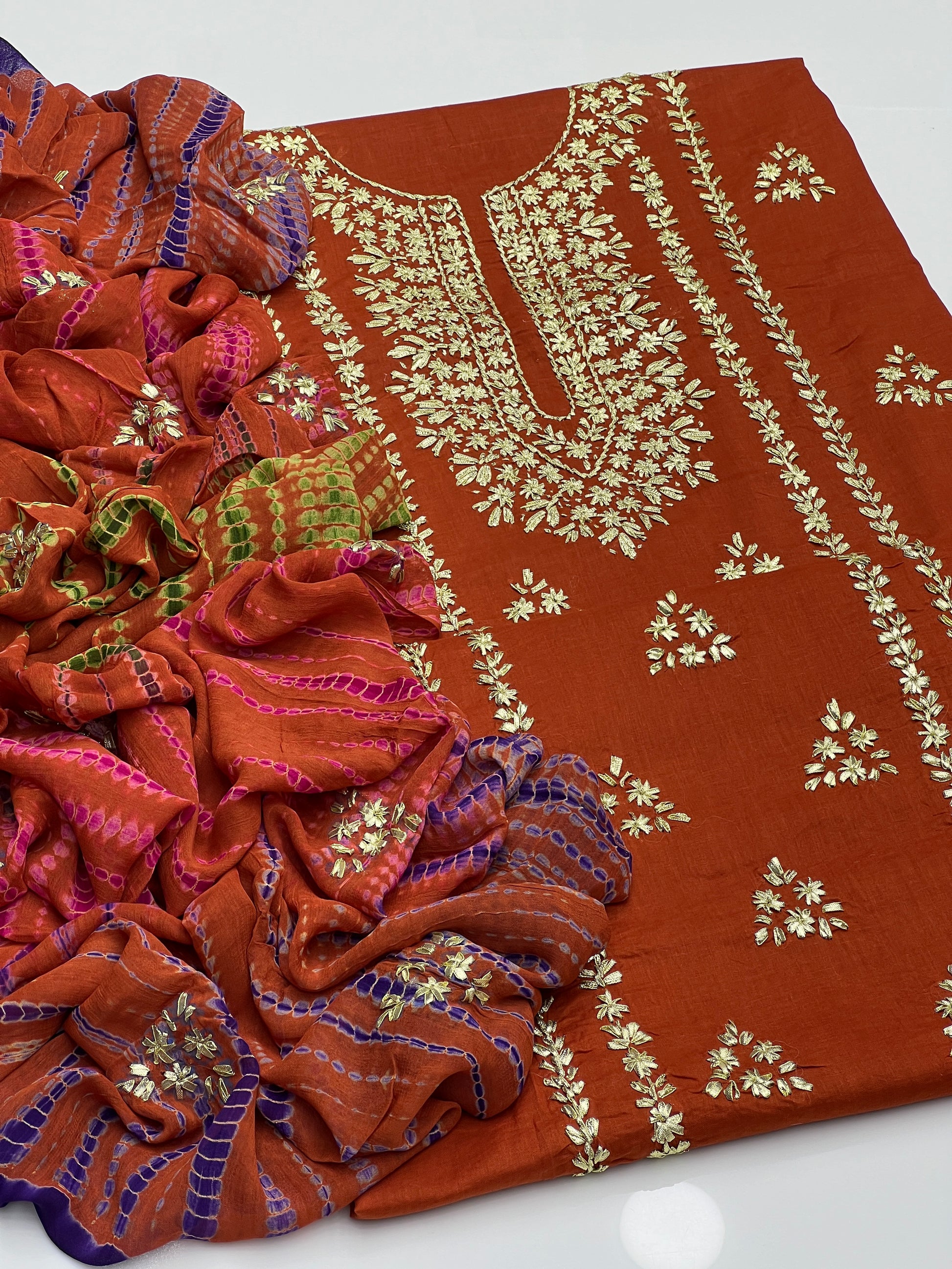 Handmade Gotta Work On Lawn Kurta Style Shirt With Tie n Die Shifoon Dupatta Along Plain Trouser 3pc Suit…