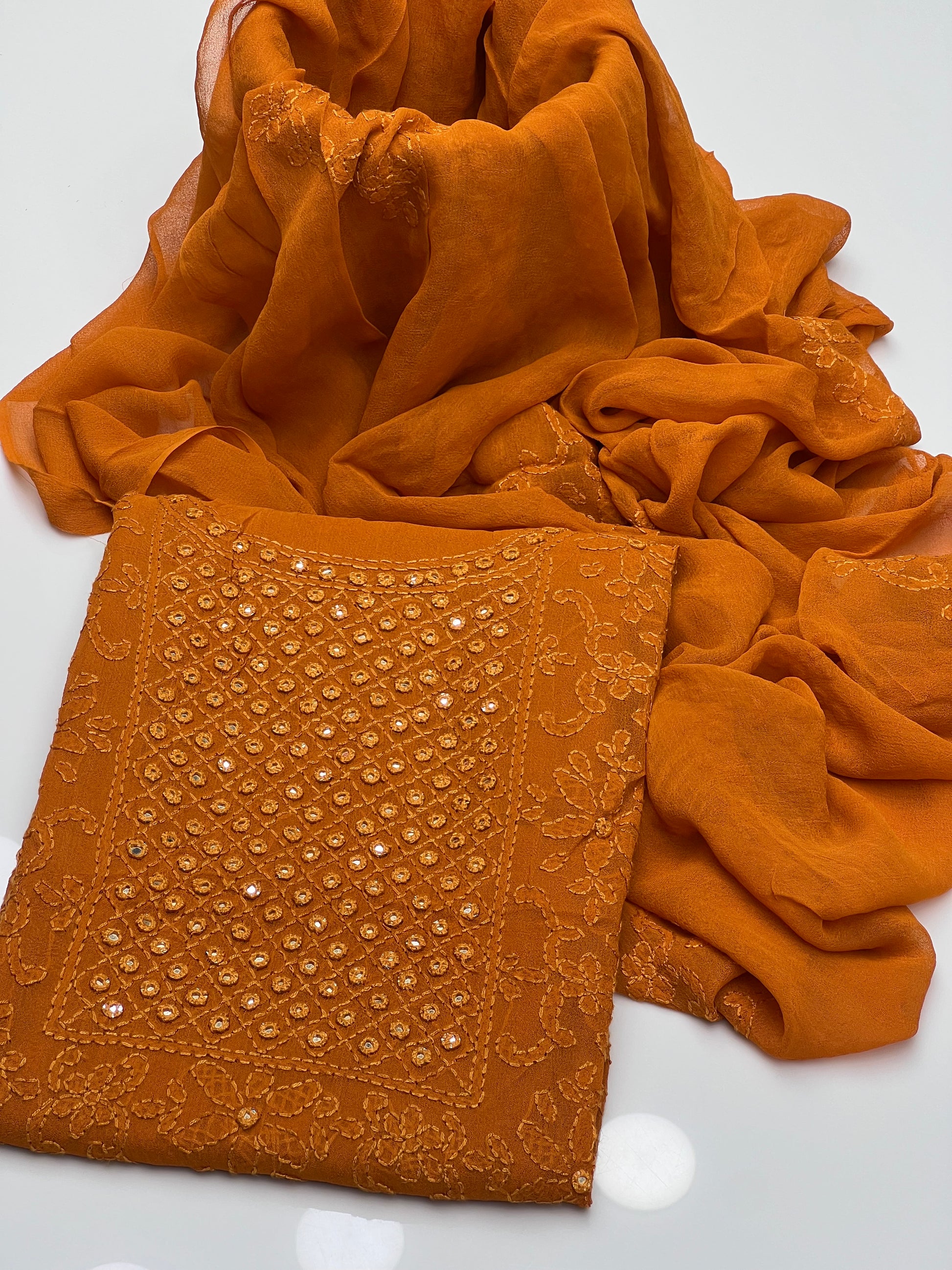 Handmade Shedow Tanka With Mirror Work On Soft Shifoon Full Shirt Jall With Booti Work Dupatta 2pc Suit…